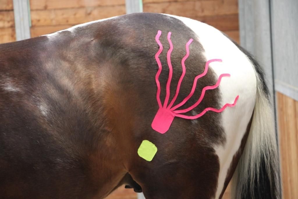 Beim Kinesio-Taping werden spezielle Klebestreifen auf die Haut des Pferdes aufgebracht. Durch die Form, Beschichtung und Beschaffenheit des Tapes sollen bei Bewegungen des Pferdes Hautebenen verschoben und dadurch die Muskeln und Rezeptoren unter der Haut angeregt werden. Das wiederum kann die körpereigene Heilung fördern und Schmerzen lindern.
